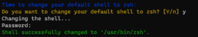 설치가 진행되다보면 기본 shell 을 zsh 로 변경할것인지 물어보는 문구가 나오는데 주저없이 y를 눌러준다.