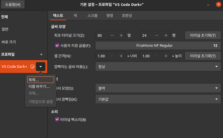 그리고, 다시 폰트 설정을 바꿔 주어야 하는데 위의 Gogh 테마를 기본 설정창에서 사용자지정글꼴에 체크를 해주고 FiraMono Regular 를 선택해주면 끝!