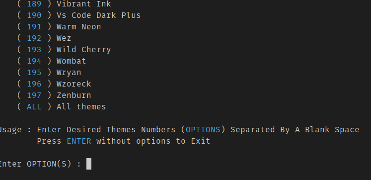 명령어를 입력하면 약 200 가지의 색상 설정 값이 나오는데 위의 install 아래쪽으로 각 설정들의 생상을 볼 수 있도록 되어 있으니 맘에 드는 설정값의 이름을 보고 설정값의 번호를 입력하면 바로 다운로드가 된다.
