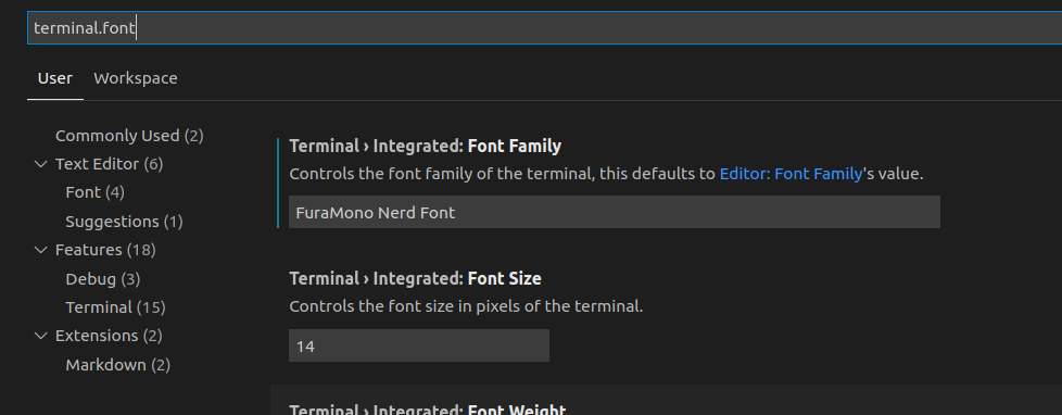 위의 방법처럼 vsCode에서 설정으로 들어가서 검색창에 terminal.font를 검색하면 가장 상단에 폰트 설정을 볼 수 있는데, 여기에 FuraMono Nerd Font를 입력해 주면 된다. 왜인지는 모르겠지만 .. FiraMono가 아니라 FuraMono 로 입력해야 한다.. 이부분만 주의 해서 입력해 주면 아무 문제없이 정상작동 하는 것을 확인 할 수 있을 것이다.