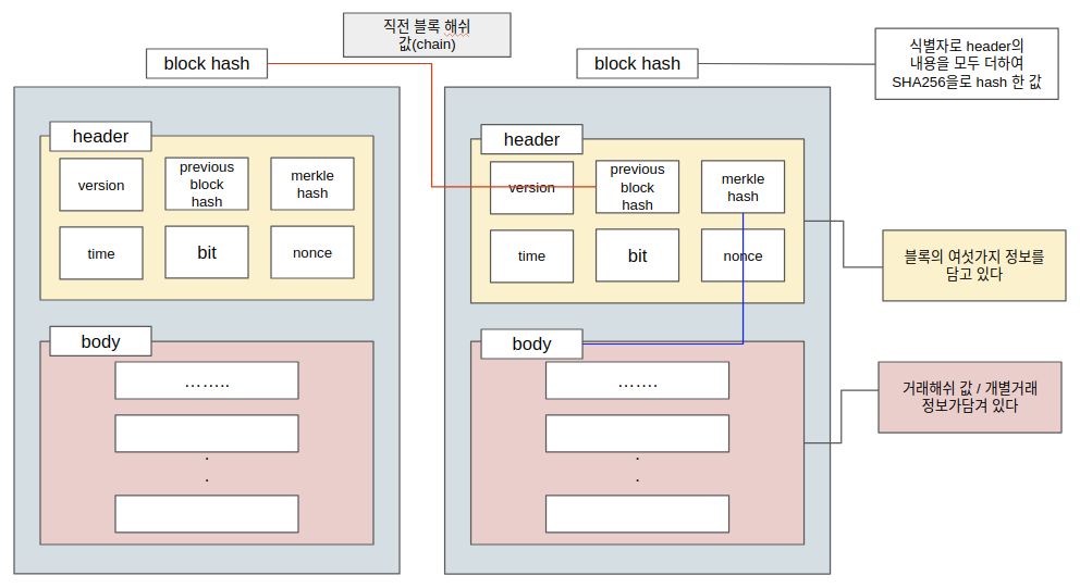 - merkle hash : 개별 거래 정보의 거래 해쉬를 2진 트리 형태로 구성할 때, 트리 루트에 위치하는 해쉬 값